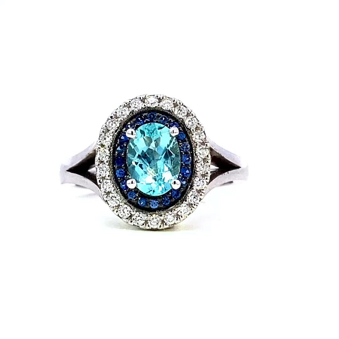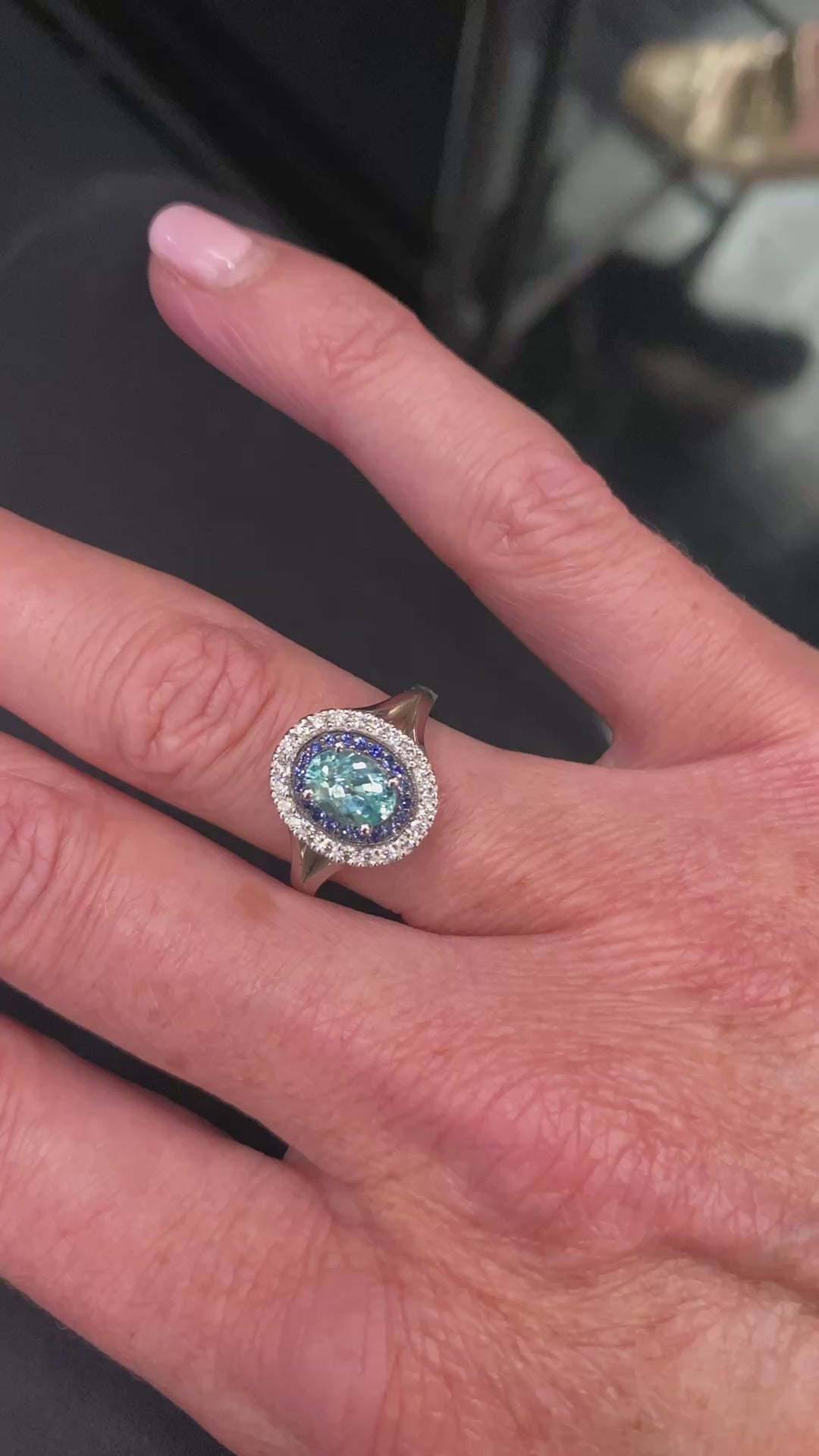 This exquisite Paraiba Tourmaline Ring, custom crafted by Trewarne Fine Jewellery, showcases a rare Paraiba Tourmaline with a vivid electric blue hue. Set in an 18ct white gold band, the romantic vintage-style galleried setting enhances the stone’s extraordinary colour while adding timeless elegance. Accented with carefully selected sapphires and diamonds, this ring exemplifies expert craftsmanship designed to highlight the unique brilliance of the Tourmaline.
