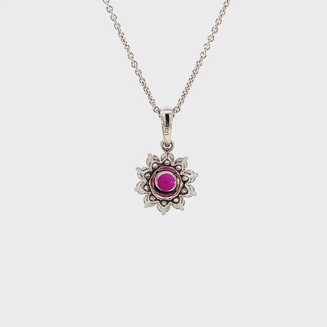 18ct White Gold ruby and diamond cluster pendant. This natural ruby is a 0.28ct with round brilliant cut diamonds claw set = 0.25ct with a solid white gold bail.
