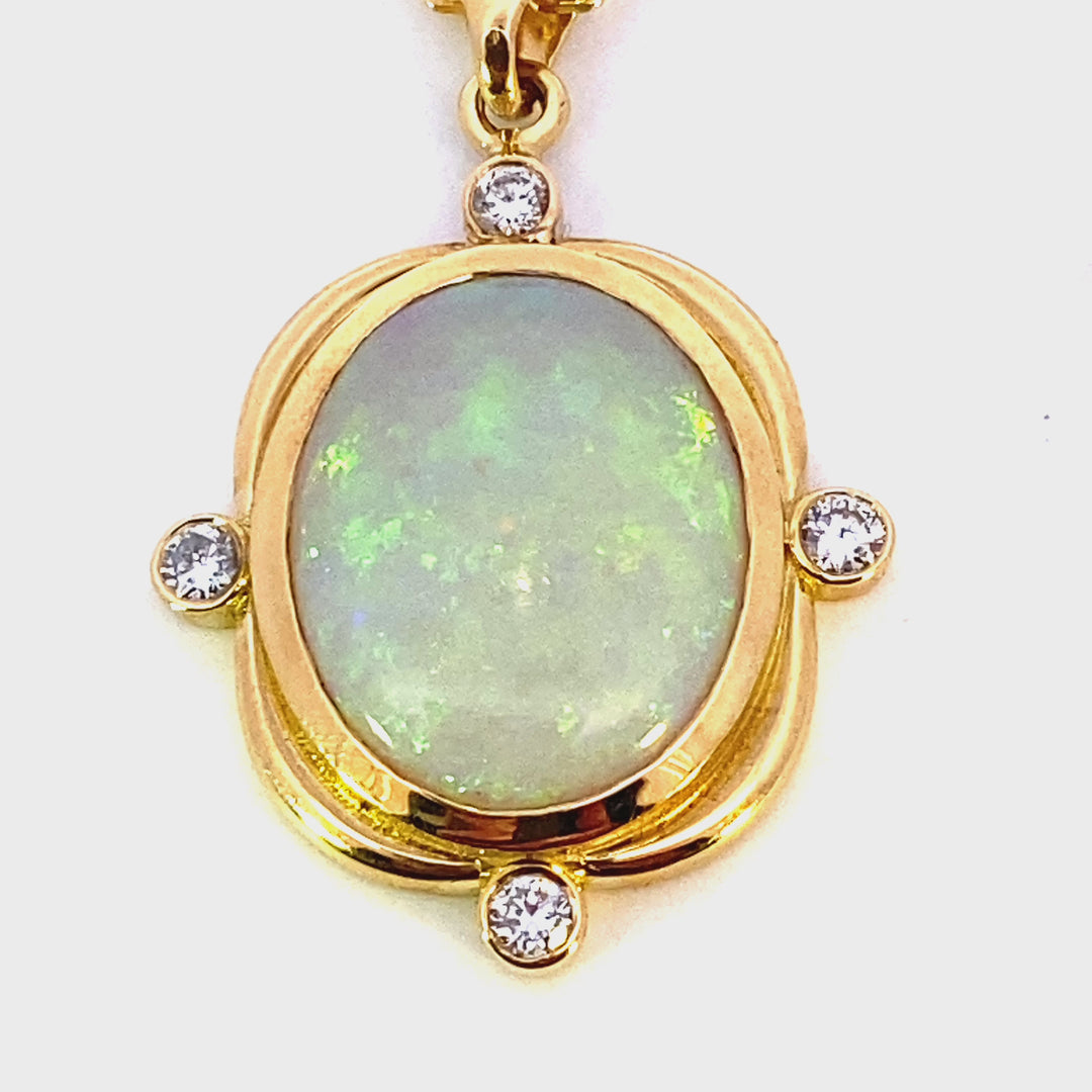 18ct yellow gold solid white opal and diamond pendant