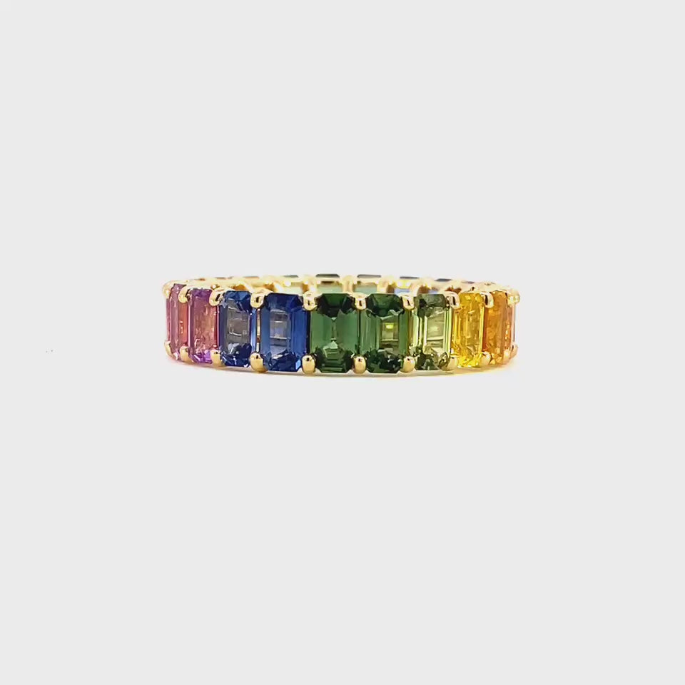 Beautiful transitions of natural coloured Sapphires combine to make the ultimate rainbow full circle eternity ring.
